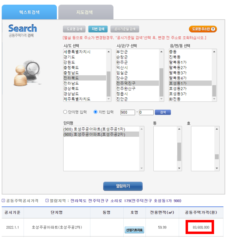 아래 예시는 전라북도 전주덕진구 호성동1가에 있는 호성주공아파트(호성주공2차)에 대한 공시가격을 열람한 결과이다.