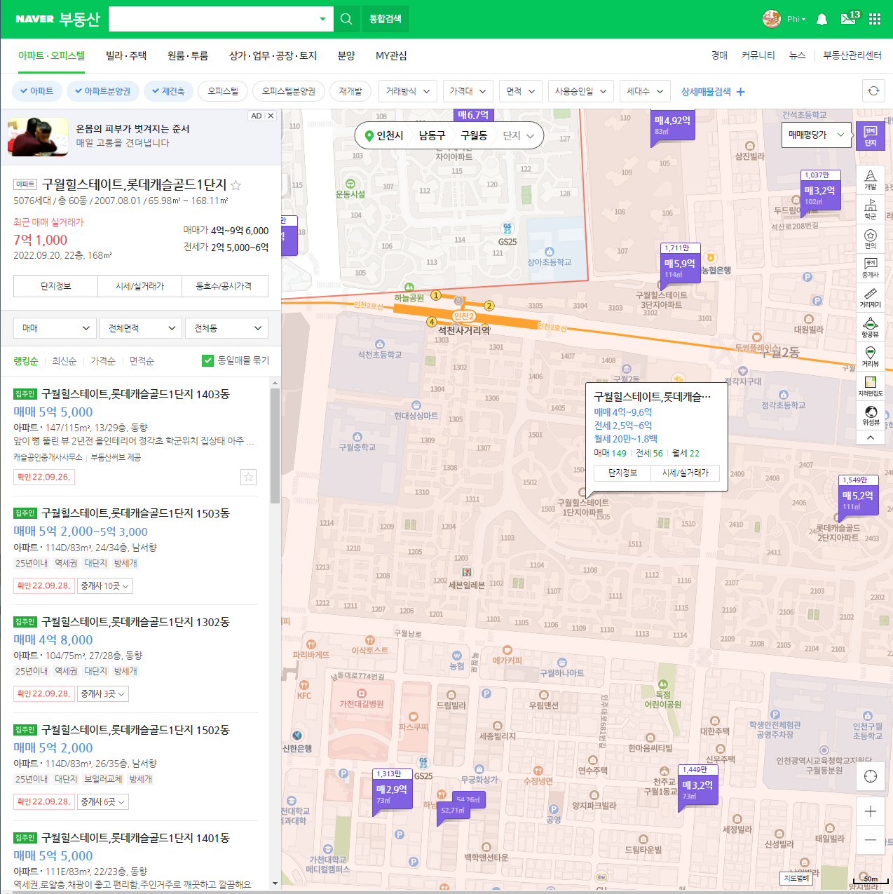 아래 그림은 인천 석천사거리역 근처 구월힐스테이트, 롯데캐슬골드 1단지를 눌러보았다.