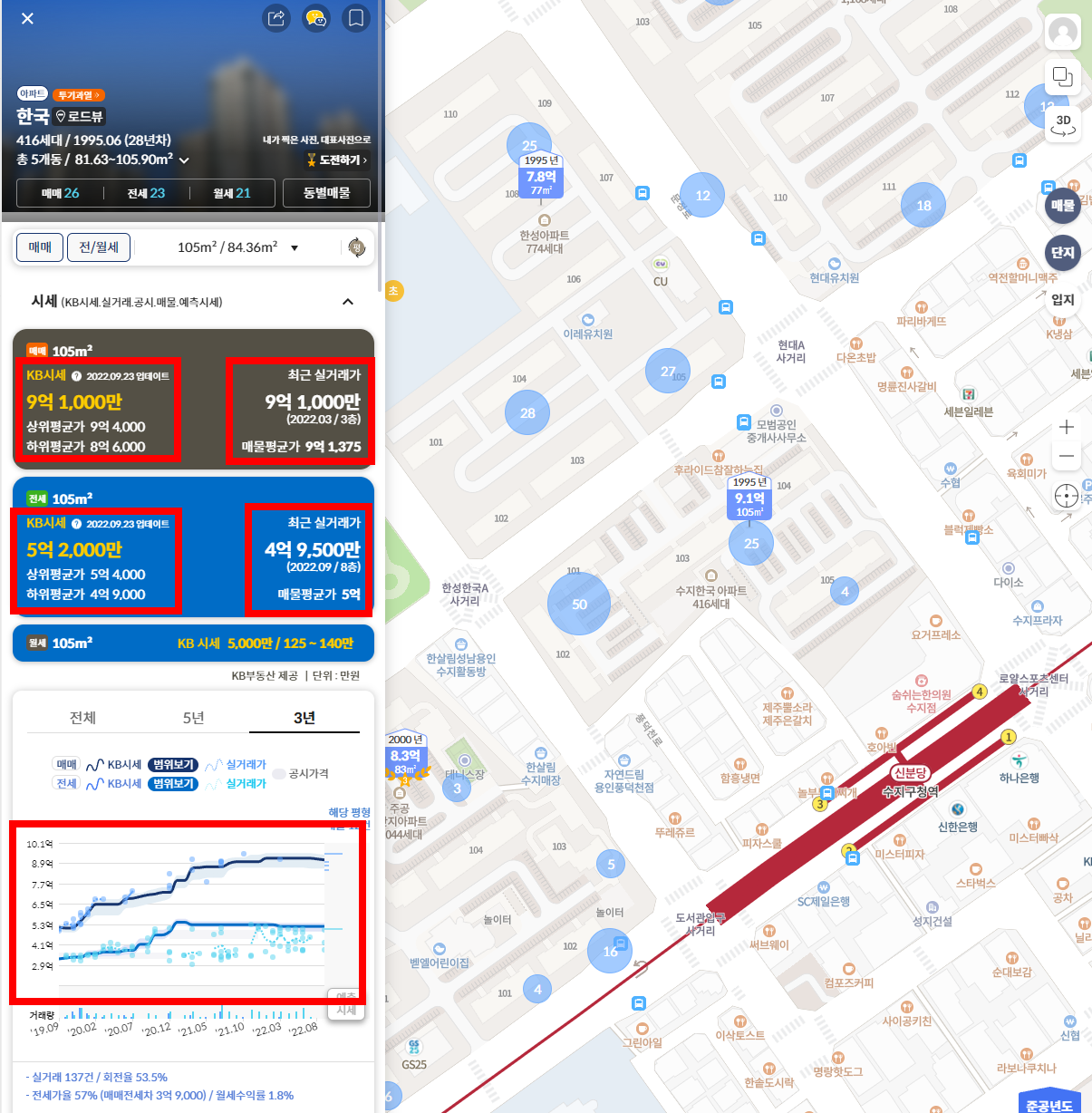 (아래 그림에서는 수지구청역 근처 한국 아파트를 눌러 보았다.)