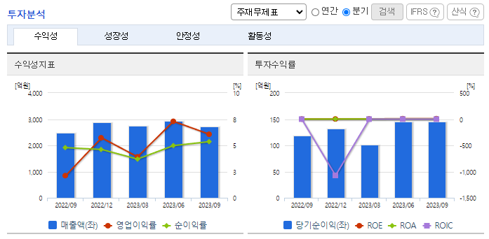 -2023년 9월 전년동기 대비 연결기준 매출액은 13.9% 증가, 영업이익은 766.5% 증가, 당기순이익은 540.6% 증가. 국내, 해외 모두에서 매출이 증가하였음에도 세금 및 공과가 53% 감소하는 등 판관비가 감소함에 따라 영업이익 크게 증가함. 주요 매출처는 현대자동차와 기아자동차로서, 해당 매출처의 비중이 2023년 3분기 전체 매출액의 52.2%를 차지하고 있음.