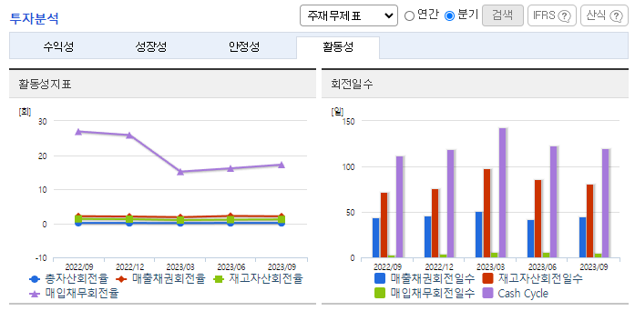 -2023년 9월 전년동기 대비 연결기준 매출액은 2.9% 감소, 영업이익은 39.2% 감소, 당기순이익은 40% 감소. 매출이 감소한 반면 매출원가는 증가하였고, 판매관리비 또한 증가하여 수익은 감소, 비용은 증가하는 양상을 띔. 미국뿐만 아니라 유럽, 일본 등에서 전년 대비 30% 이상의 수주를 달성하고, 2022년 대비 약 130% 증가한 수출 물량을 확보한 상태로 수주량도 점점 늘어날 것으로 예상함.
