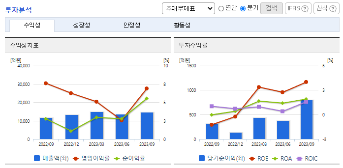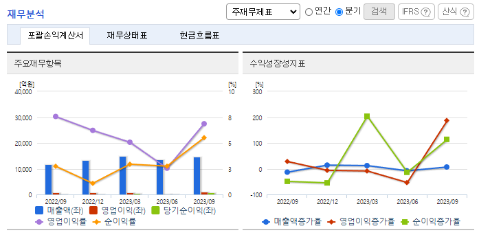 -2023년 9월 전년동기 대비 연결기준 매출액은 16.3% 증가, 영업이익은 177.6% 증가, 당기순이익 흑자전환. 동사의 2023년 매출은 지주, 건설, 유통 부문에서 고루 상승하였으며 지급수수료, 광고선전비 등의 판관비 절약을 위한 노력 등으로 영업이익이 큰 폭으로 증가함. 건설부문에서는 랜드마크형 단지개발과 독창적인 평면, 조경시설, 마감디자인 강화로 IPARK 브랜드 경쟁력을 강화함.