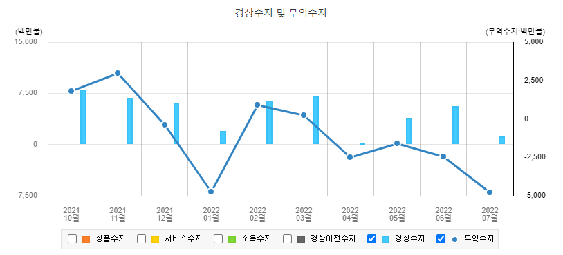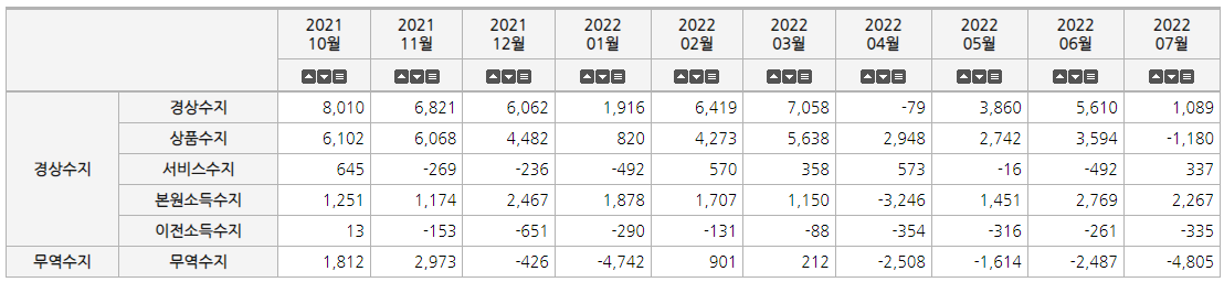 현재 경상수지를 보면 수치가 들쭉 날쭉 하여 특정한 트렌드를 확인하기가 어렵다. 1달 주기로 데이터가 업데이트 되며 22년도 7월 수치까지 나와있다.