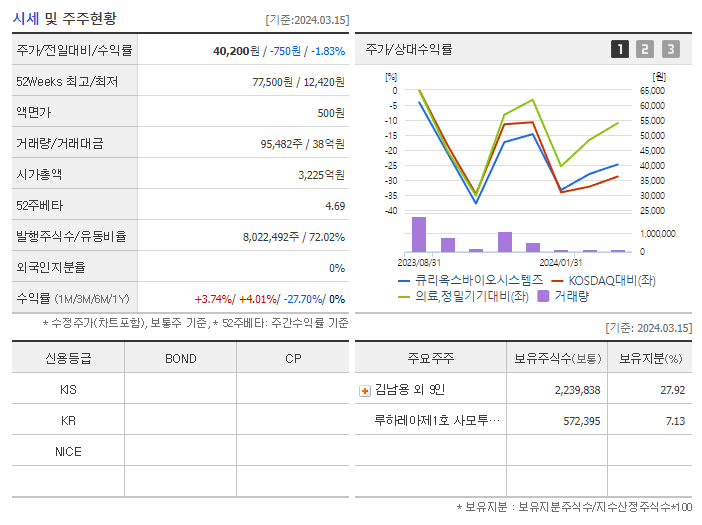 큐리옥스바이오시스템즈 현재 주가는 40,200원이며 전일 대비 -750(-1.83%)원의 모습을 보이고 있습니다. 큐리옥스바이오시스템즈의 주주현황을 살펴보면 김남용(외 9인)이 지분 27.92%를 소유하고 있습니다.