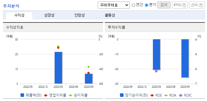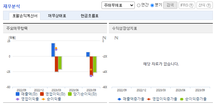 -2023년 9월 전년동기 대비 연결기준 매출액은 2.7% 감소, 영업손실은 4.2% 감소, 당기순손실은 1.4% 증가. 전분기 대비하여 매출이 약 60%이상 감소하였고, 제품 매출이 70% 이상 감소하였음. 하지만 전년 대비 인건비 비용이 감소하여 영업이익은 증가하였음. 미국, 중국 상하이, 영국, 독일 등 유럽의 일부 국가에는 직접판매 방식, 중국(상하이 제외), 나머지 유럽국가에는 간접판매 방식으로 판매함.