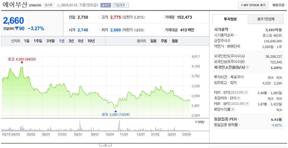 에어부산은 항공운수 기업으로 장중 기준으로 주가는 2,660원입니다. 에어부산의 시가 총액은 3103억 원이며 발행 주식수는 116,640,000주입니다. 외국인 보유 비중은 1.24%이며 장중 거래량은 152,473를 기록했습니다. 23년 3분기 매출액은 2,305억 원, 영업이익은 433억 원을 달성했으며, EPS는 132원입니다. 에어부산 주식 배당수익률은 없습니다.