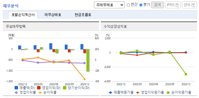 -2023년 9월 전년동기 대비 연결기준 매출액은 34.4% 증가, 영업손실은 1267% 증가, 당기순이익 적자전환. 연구개발비용이 88.9억으로 매출대비 연구개발비 비용이 19.4%로 제약업 특성상 신약에 대한 매출이 발생하기 전에는 손실이 확대될 수밖에 없는 구조임. 최대주주인 ㈜에이프로젠에서 개발 중인 바이오신약 및 임상시험과 품목허가를 추진 중인 바이오시밀러의 연구개발이 완료되면 동사의 생산시설에서 상업 생산을 진행할 계획임.
