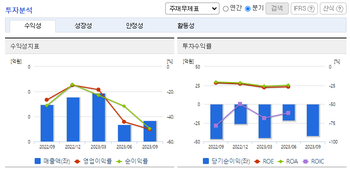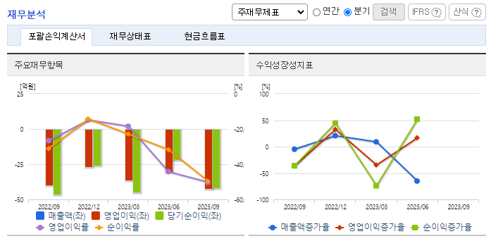 -2023년 9월 전년동기 대비 별도기준 매출액은 13.8% 증가, 영업손실은 58% 증가, 당기순손실은 35% 증가. 향후 임상 진행 중인 파이프라인의 기술이전 시 큰 규모의 기술료 용역 매출이 발생할 것으로 예상됨. NOX 저해제 관련 파이프라인 대부분은 2021년 임상 2상이 완료됨에 따라 2022년 이후부터 본격적인 협의가 진행되고 있으며 후속 파이프라인 개발을 위한 전략적 제휴도 활성화할 계획임.