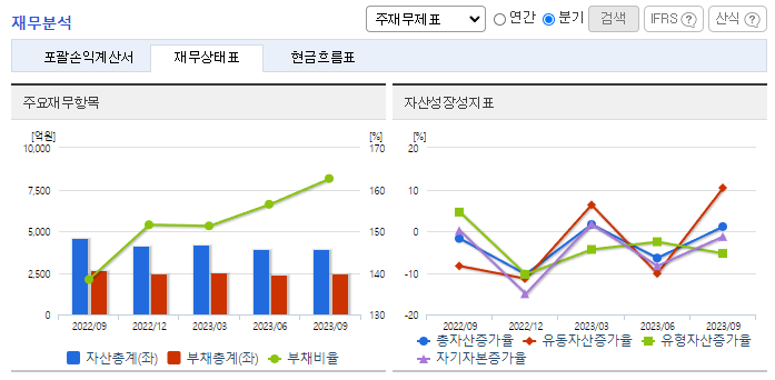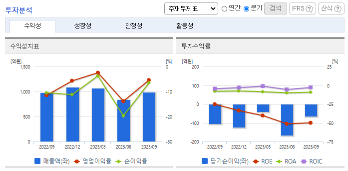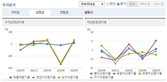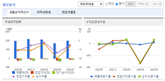 -2023년 9월 전년동기 대비 연결기준 매출액은 17.2% 감소, 영업손실은 20.4% 증가, 당기순손실은 47.1% 증가. 전방산업 부진으로 스마트폰 카메라/렌즈모듈 사업 매출 감소, 일부 원가절감 및 판관비 축소 등에도 불구하고 영업손실 및 순손실이 확대됨. 기술, 가격 경쟁력 제고 및 제조기반 경쟁력 우위 확보를 위해 지속적으로 노력하고 있으며, 신개념 제품의 개발에 대한 노력과 판매 물량 확보를 목표함.