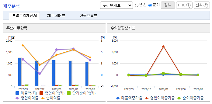 -2023년 9월 전년동기 대비 연결기준 매출액은 17.3% 감소, 영업이익은 36% 감소, 당기순이익은 56.1% 감소. 에탄올류의 원재료는 5% 하락, 석유화학류의 원재료는 21.7% 하락하여 원가를 절감하였으나 매출감소로 영업이익이 감소함. 2023년 10월 31일 국내 석유화학 제조기업과 2698억 원 규모 2차 전지 전해액 유기용매용 고순도 에탄올 공급계약을 체결을 공시했으며, 이는 지난해 매출액의 52.63%에 달하는 규모임.