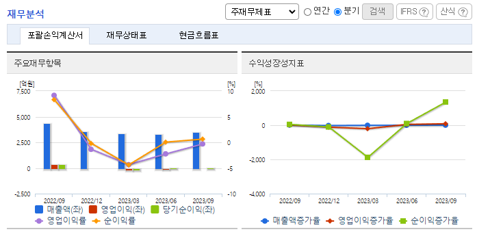 -2023년 9월 전년동기 대비 연결기준 매출액은 17.9% 감소, 영업이익 적자전환, 당기순이익 적자전환. 동사의 2023년 3분기 매출에서 임대 사업부문은 전년 동기 대비 소폭 증가하였지만 PCB제품, 반도체 제품의 매출이 전체적으로 감소하였음. 또한 판관비중 복리후생비, 판매보증비 등이 큰 폭으로 증가하여 2023년 3분기 동사의 영업이익이 적자전환 되었음.