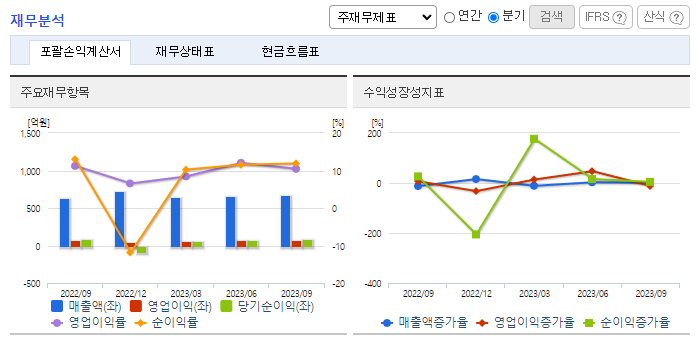 -2023년 9월 전년동기 대비 연결기준 매출액은 0.4% 증가, 영업이익은 11.4% 감소, 당기순이익은 16.6% 감소. 아날로그 제품군의 평균판매가격은 2022년 3분기 대비 하락하였으며, 네트워크 제품군과 IP카메라의 평균판매가격은 하락, VMS는 상승함. 단품의 경쟁력보다 Total solution의 경쟁력이 더욱 중요해지는 시장 변화에 대응하여, 유기적인 연결 동작을 지원하는 유용한 AI solution를 출시할 예정임.