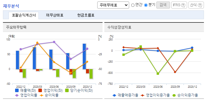 -2023년 9월 전년동기 대비 연결기준 매출액은 10.8% 증가, 영업손실은 51.4% 감소, 당기순손실은 0% 감소. 동사의 주력 제품인 마이크로니들 패치를 통해 미국 및 일본에서 안정적인 고객사를 확보하였고 국내 매출 비중을 증가시키는데도 노력하고 있음. 광고선전비 및 지급수수료 등과 같은 판매비와 관리비 등 비용감소에 노력하여 동사의 2023년 영업손실 폭이 전년동기대비 감소하였음.
