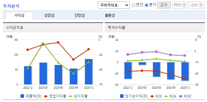 -2023년 9월 전년동기 대비 연결기준 매출액은 10.8% 증가, 영업손실은 51.4% 감소, 당기순손실은 0% 감소. 동사의 주력 제품인 마이크로니들 패치를 통해 미국 및 일본에서 안정적인 고객사를 확보하였고 국내 매출 비중을 증가시키는데도 노력하고 있음. 광고선전비 및 지급수수료 등과 같은 판매비와 관리비 등 비용감소에 노력하여 동사의 2023년 영업손실 폭이 전년동기대비 감소하였음.