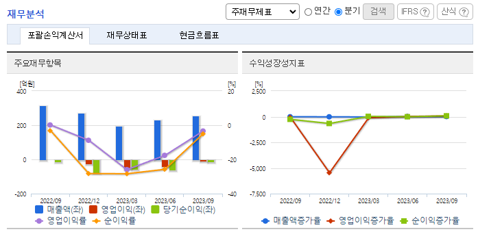 -2023년 9월 전년동기 대비 연결기준 매출액은 28% 감소, 영업손실은 2810.1% 증가, 당기순이익 적자전환. 3분기에 마무리한 생산시설 증설로 공정을 개선하고, 신규 장비 투자, 자동화 라인 구축 등으로 생산 능력을 확대했으며 이어 효율성을 높이고 불량률도 개선했음. 생산설비 증설을 통한 매출 성장 극대화가 예상되며, ADM 신제품 출시를 통한 신성장 동력 확보에도 주력할 계획임.