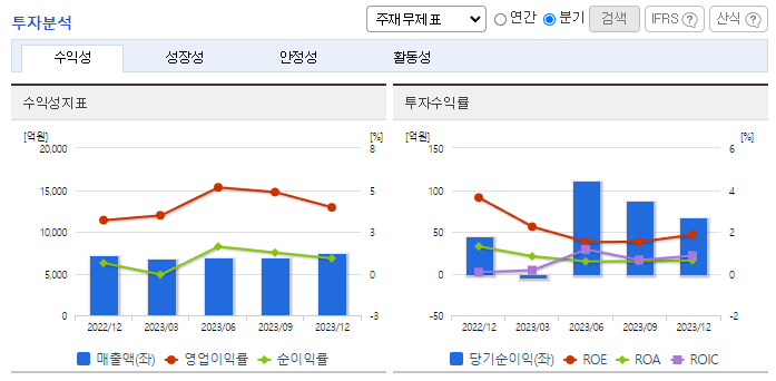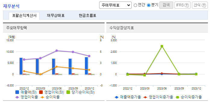 -2023년 9월 전년동기 대비 연결기준 매출액은 3.3% 감소, 영업이익은 1.5% 증가, 당기순이익은 63.2% 감소. 택배사업부문을 제외한 사업부문은 매출이 감소함. 그럼에도 원가 절감 및 물류 사업 수익성 개선으로 영업이익은 증가함. 2024년 1분기 개장 예정인 대전 스마트 Mega Hub 터미널은 일 120만 Box를 처리가능한 규모의 물류 자동화설비를 갖춘 터미널로 운영원가 절감을 통한 성장을 기대하고 있음.