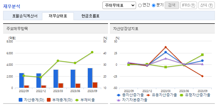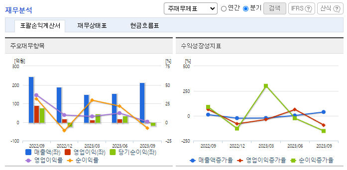 -2023년 9월 전년동기 대비 연결기준 매출액은 59.4% 감소, 영업이익은 95.3% 감소, 당기순이익은 87.8% 감소. 주력분야인 분자진단서비스 용역 매출의 부진으로 외형 축소된 상황이며, 고정비 부담 증가 여파로 수익성 또한 하락한 모습. 코로나 진정으로 진단키트분야의 성장성은 둔화될 것이나, 분자진단 분야에서의 경쟁력 계속 강화되고 있어 장기적 관점에서 실적 개선 가능할 것으로 기대.