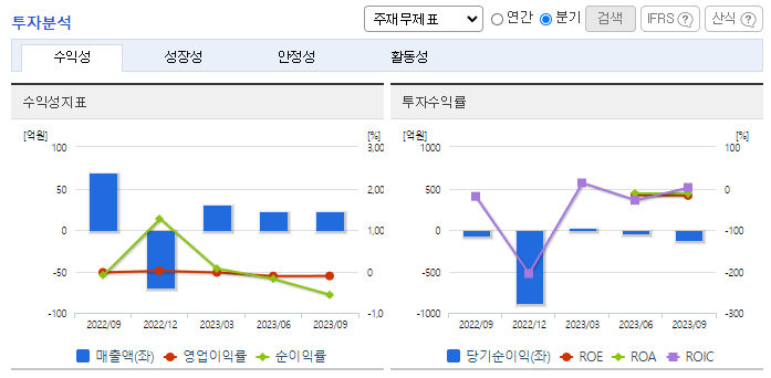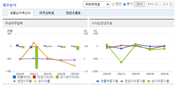 -2023년 9월 전년동기 대비 연결기준 매출액은 67.1% 감소, 영업손실은 208.6% 증가, 당기순손실은 84.3% 감소. 동사는 '23.07.18 횡령·배임 혐의 발생을 공시함에 따라, 코스닥시장상장규정 제56조 제1항 제3호 나목의 규정에 의거 상장적격성 실질심사 사유가 발생. 또한, 주권매매거래정지기간이 상장적격성 실질심사 대상여부에 관한 결정일까지로 변경됨.