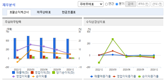 -2023년 9월 전년동기 대비 연결기준 매출액은 4.4% 증가, 영업이익은 10% 증가, 당기순이익은 102.7% 증가. 전년동기 대비 매출이 소폭 상승했으나 판관비, 인건비 등 비용 상승을 억제하면서 영업이익과 당기순이익이 증가하는 효과를 얻음. 코로나19(COVID-19)로 인한 사회적 거리 두기의 완화에 따라 오프라인 시장의 회복이 예상되는 바, 동사는 가맹 중심의 추가 출점 등을 계획하고 있음.