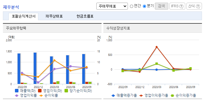 -2023년 9월 전년동기 대비 연결기준 매출액은 1.1% 감소, 영업이익은 30.3% 증가, 당기순이익은 37.4% 증가. 2분기 이후 매출 상승세가 둔화되면서 전년동기 수준을 소폭 하회하는 매출 기록하였으나, 원자재 가격의 하락 영향으로 영업수익성은 비교적 큰 폭의 상승세를 시현함. 플라스틱 산업의 긍정적 전망과 함께 꾸준한 매출활동 및 대체품 개발 등으로 지속적으로 성장할 것으로 기대함.