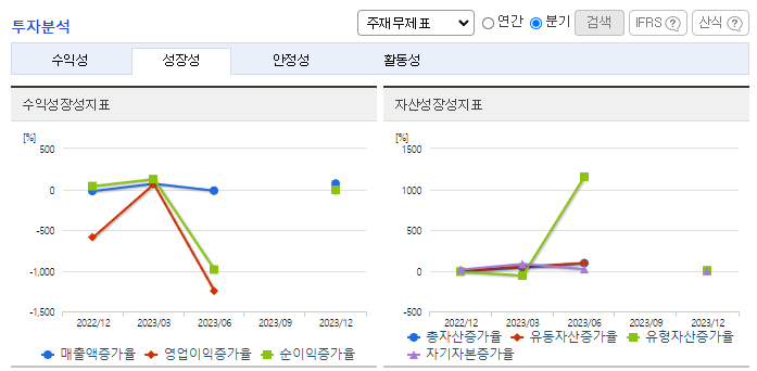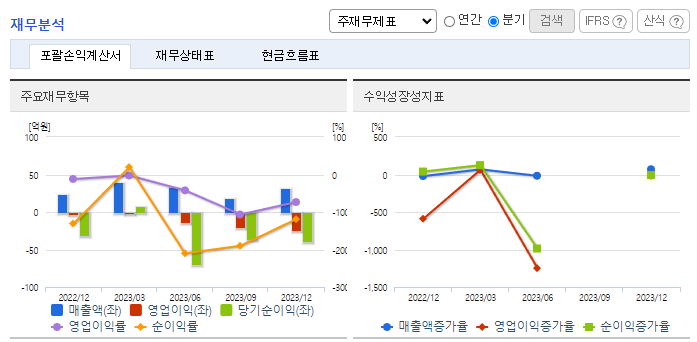 -2023년 9월 연결기준 매출 실적은 9,197,190,111원, 영업이익은 3,433,654,982원의 적자, 당기순이익은 9,387,002,648원 적자를 기록함. 매출원가와 판관비가 매출액을 초과하면서 영업이익 적자, 법인세환급분을 포함한 당기순이익도 적자를 기록. 신규 사업 분야로 로봇 산업에 진출하기 위해 준비하고 있음. 로봇 관련 부품 생산 및 조립을 위한 제조 라인을 구축하고 양산을 위한 제반 절차를 진행 중임.