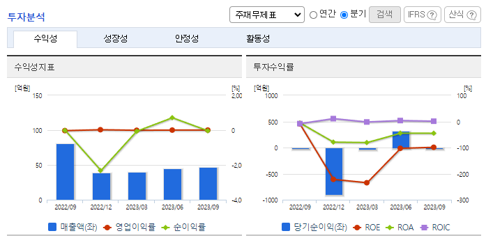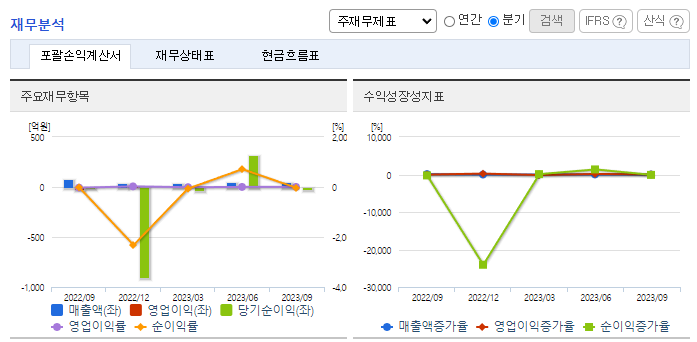 -2023년 9월 전년동기 대비 별도기준 매출액은 10.5% 증가, 영업이익 흑자전환, 당기순이익 흑자전환. 동사 매출부문 중 Trocar(투관침) 매출이 5.41% 증가, LapBag(생체검사도구) 매출이 18.72% 증가하며 전체 외형 성장을 이끎. 영업 외 손익에서 금융상품평가이익과 사채상환이익이 포함된 기타 수익이 980.75% 증가하면서 당기순이익에 긍정적인 영향을 줌.