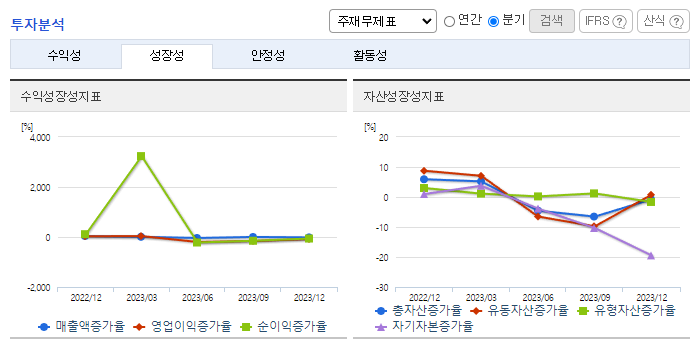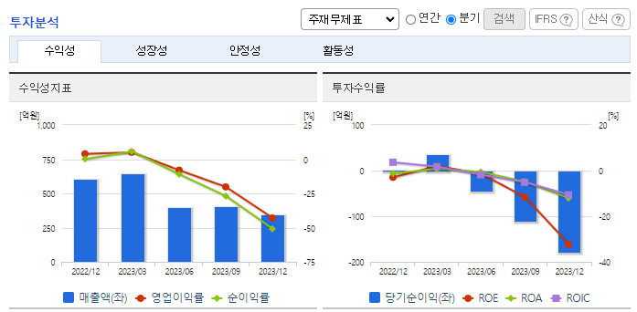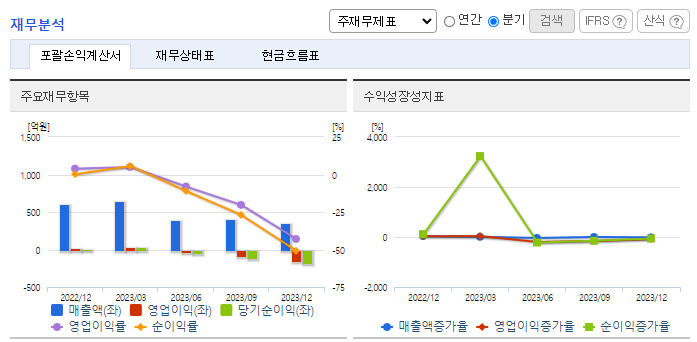 -2023년 9월 전년동기 대비 연결기준 매출액은12.2% 증가, 영업이익 적자전환, 당기순손실은 266.8% 감소. 동사의 통신사업 부문(통신선 제조), 전력사업 부문(전력선 제조) 매출액이 모두 전년동기 대비 상승하였지만, 원가율 악화와 판매비 및 인건비 또한 상승하여 영업이익이 적자 전환. 주요 Major업체에 대한 집중관리를 통해 공급선을 안정적으로 확보하여 생산의 효율성을 높이는데 노력.