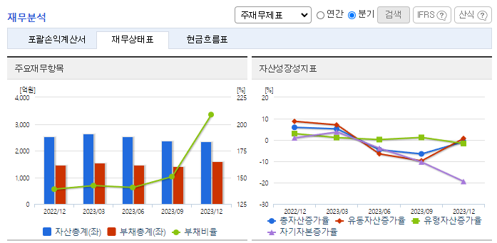 -2023년 9월 전년동기 대비 연결기준 매출액은12.2% 증가, 영업이익 적자전환, 당기순손실은 266.8% 감소. 동사의 통신사업 부문(통신선 제조), 전력사업 부문(전력선 제조) 매출액이 모두 전년동기 대비 상승하였지만, 원가율 악화와 판매비 및 인건비 또한 상승하여 영업이익이 적자 전환. 주요 Major업체에 대한 집중관리를 통해 공급선을 안정적으로 확보하여 생산의 효율성을 높이는데 노력.