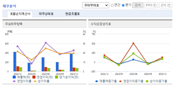 -2023년 9월 전년동기 대비 연결기준 매출액은 16.7% 증가, 영업이익은 37% 증가, 당기순이익은 32.3% 증가. 소프트웨어 및 하드웨어 기술노하우로 여타 네트워크제품과는 차별화된 가격정책을 유지해가고 있으며 제조 원가나 생산 설비에 대한 투자의 비중이 상대적으로 낮음. 고객 특성상 예산의 집행시기 등이 4분기에 많이 몰려 있기에 매출 및 영업이익 등이 1분기가 가장 적고, 4분기 비중이 가장 높음.