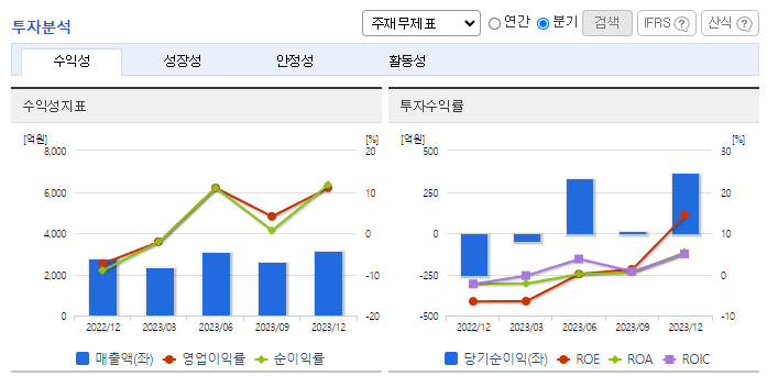 -2023년 9월 전년동기 대비 연결기준 매출액은 6.3% 증가, 영업이익은 75.6% 증가, 당기순이익 흑자전환. 매출원가, 판관비가 소폭 증가하는 등 효율적인 비용 집행을 이뤄낸 결과 영업이익이 증가함. 2023년 하반기에도 글로벌 경기둔화와 금리상승에 따른 부동산 경기 위축, SOC 투자 감소 등 영향으로 수요가 하락 전환할 것으로 예상되지만, 기존 견조한 착공실적을 바탕으로 완만한 하락세를 유지할 것으로 전망됨.