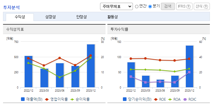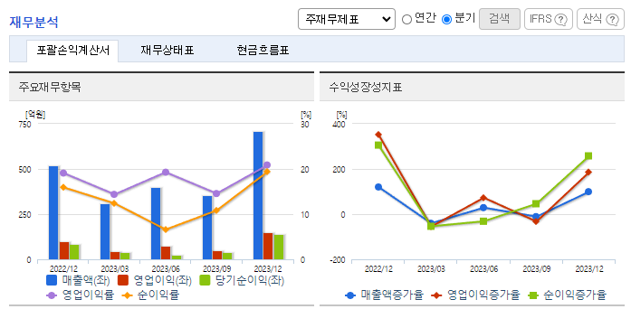 -2023년 9월 전년동기 대비 별도기준 매출액은 63.9% 증가, 영업이익은 177% 증가, 당기순이익은 53.1% 증가. '스노우피크 어패럴'의 인기에 힘입어 3분기에 역대 최대 실적을 기록했으며, 회사 설립 이후 역대 최대 실적을 기록함. 트렌디한 고품질 신제품 출시와 시의적절한 마케팅 전략을 통해 호실적을 달성했으며, 최근 10월, 11월 랜드 중경량 다운, 헤비아우터의 판매 호조로 역대 최고 실적을 달성해 가고 있음.