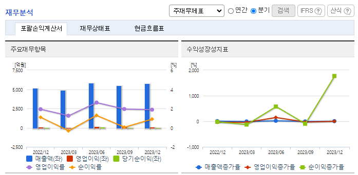 -2023년 9월 전년동기 대비 연결기준 매출액은 12.5% 증가, 영업이익은 41.8% 감소, 당기순이익은 78.9% 감소. 상품매출이 증가하여 매출액은 증가하였으나, 판관비 항목의 비중이 증가하였음. 판매지원비 등의 항목이 크게 증가하는 여파에 따라 수익성이 악화되었음. 동사는 신차, 중고차 구매에서부터 사후관리까지 연계하여 품질이 보증되는 소비자 지향적인 유통사업을 전개함으로써, 전반적인 고객 서비스 역량을 갖춰 경쟁력 확보.